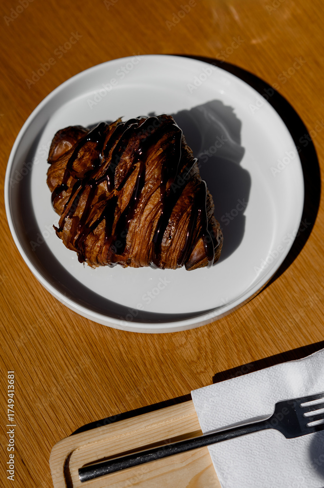 Fresh chocolate croissant on a white plate on a wooden table in a cafe