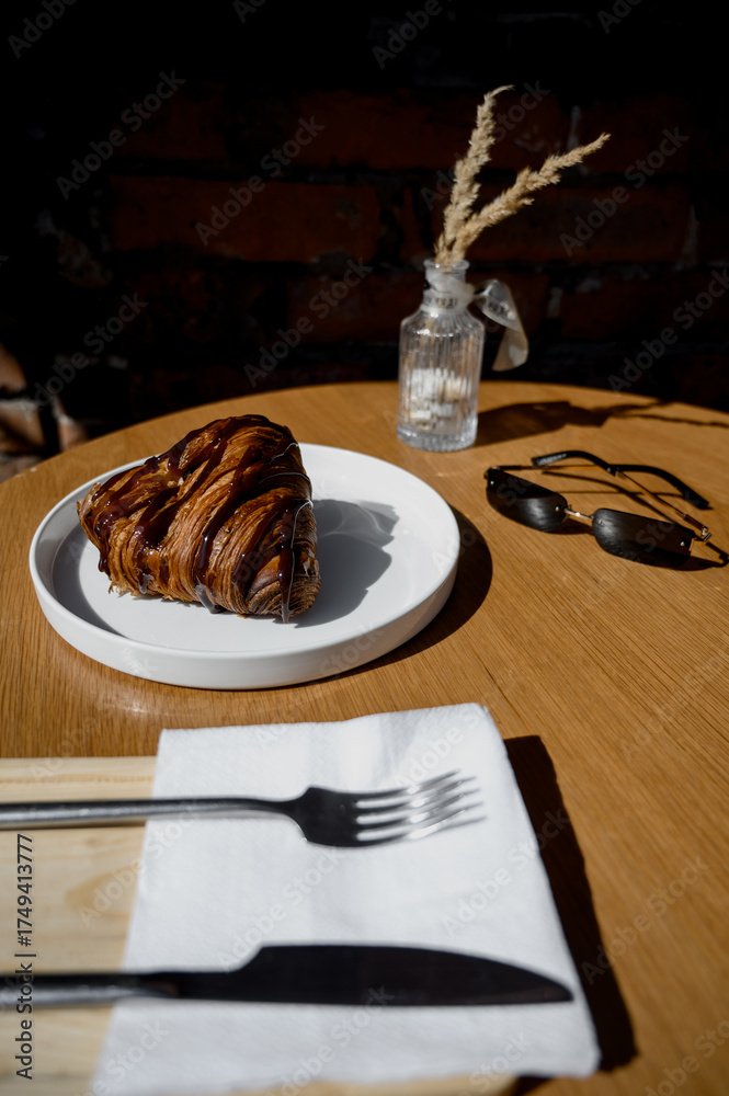 Fresh chocolate croissant on a white plate on a wooden table in a cafe