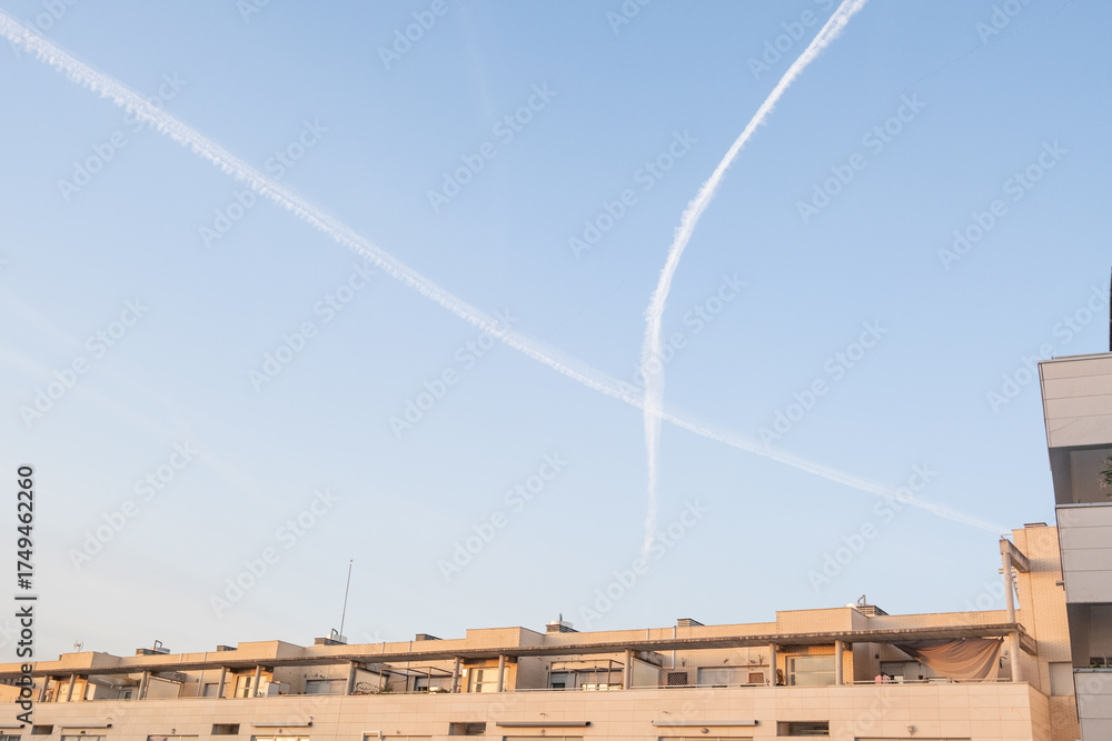 Airplane contrails crossing in blue sky above modern urban rooftop at sunset. Conceptual scene for travel, aviation, chemtrails theory, climate, city life, and environmental issues.