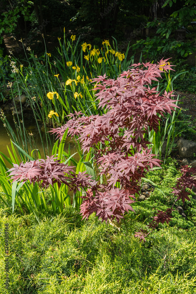 Garden scene featuring small pond surrounded vibrant yellow iris pseudacorus (yellow flag, yellow iris), and striking red foliage plants. In foreground is Japanese maple palmatum with red leaves