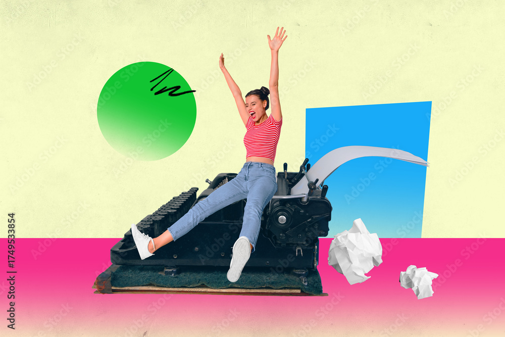 Zine banner full photo collage of happy girl guy author stand retro typewriter machine novelist occupation documentation