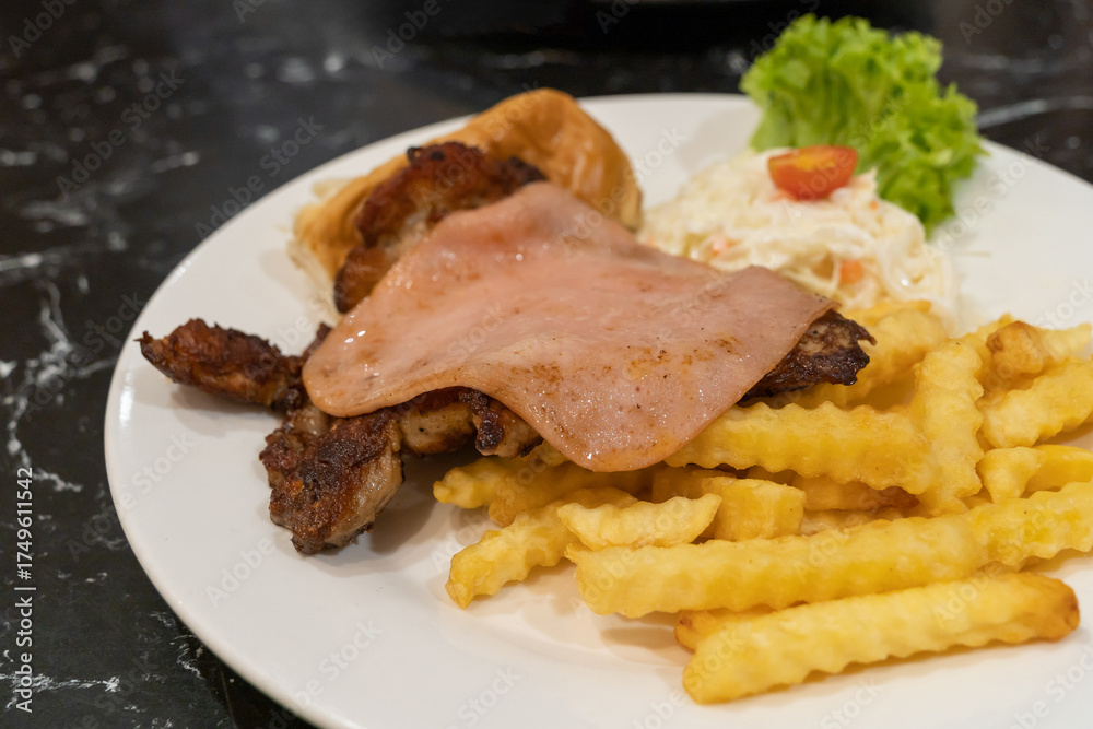 A grilled chicken chop served with slices of ham, crinkle cut fries, and coleslaw on the plate