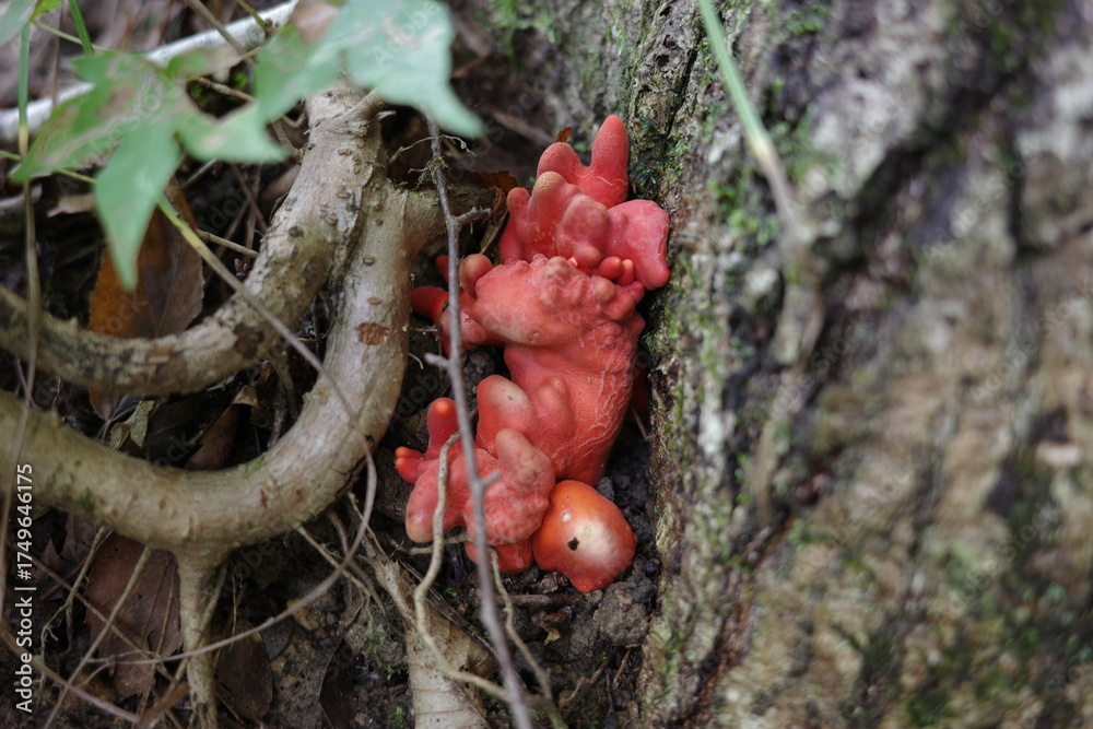 秋の広葉樹林で、コナラの根元近くに真っ赤なカエンタケが姿を現しました。鮮烈な赤色が落ち葉の中でひときわ目立ち、秋の森の中に不思議な存在感を放っています。