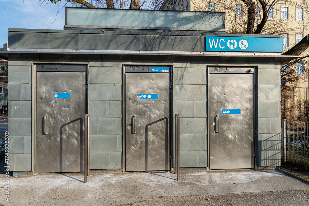 Modern public restroom building with stainless steel doors and accessibility signs under bright daylight in an urban area.