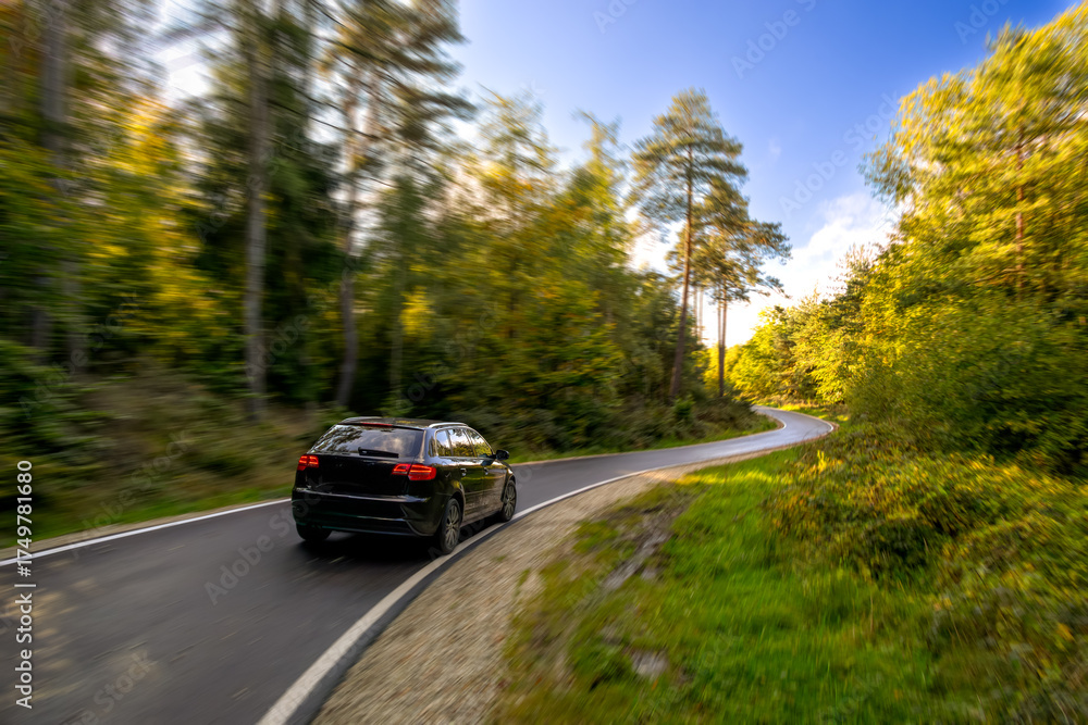 Ein fahrendes Auto auf einer sehr ländlichen Straße während die Sonne scheint im Herbst