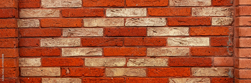Panoramic image. Brick wall with light red and dark red bricks