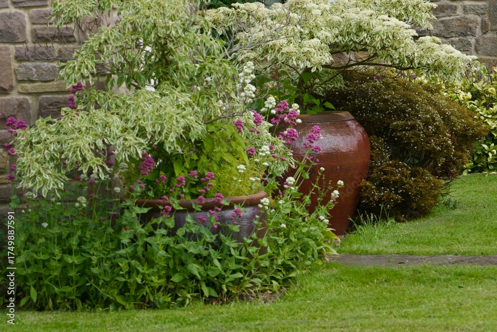 A deep flowerbed in a cottage garden of lush plants and flowers against a garden ornament.