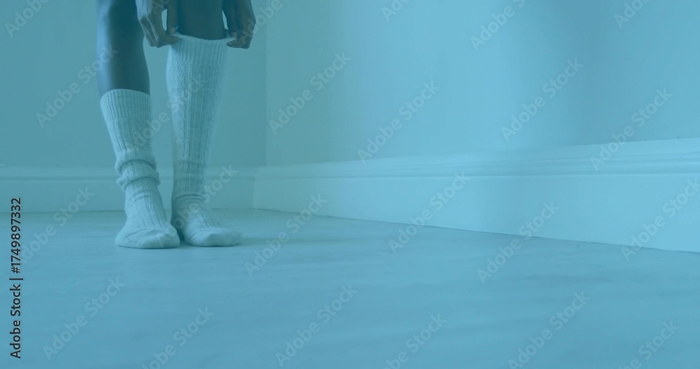 Moving woman's hands sliding sock over calf in empty room, with ribbed knit sock, copy space