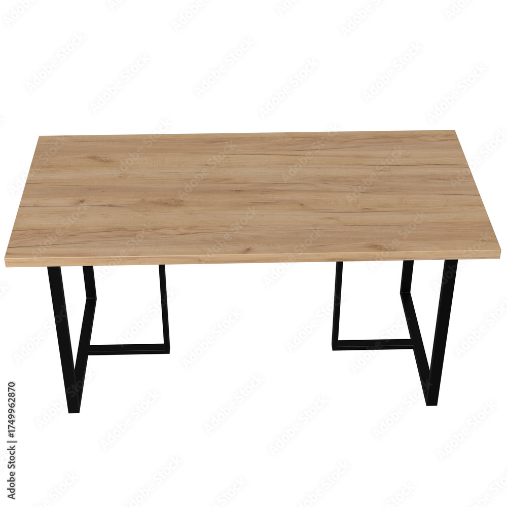 Contemporary dining table in loft style with black metal frame and wooden tabletop. Minimalist kitchen or dining room furniture on white background.