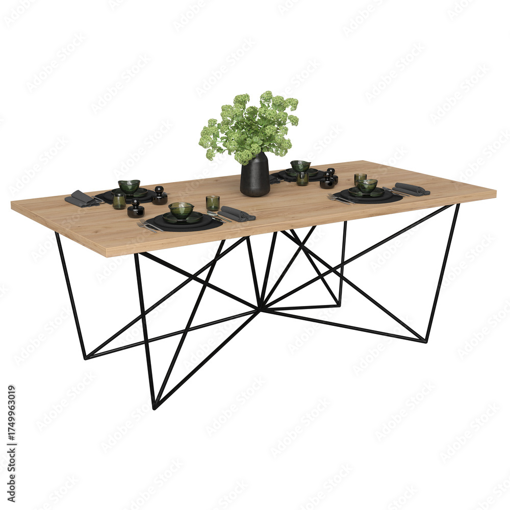 Contemporary dining table in loft style with black metal frame and wooden tabletop. Minimalist kitchen or dining room furniture on white background.
