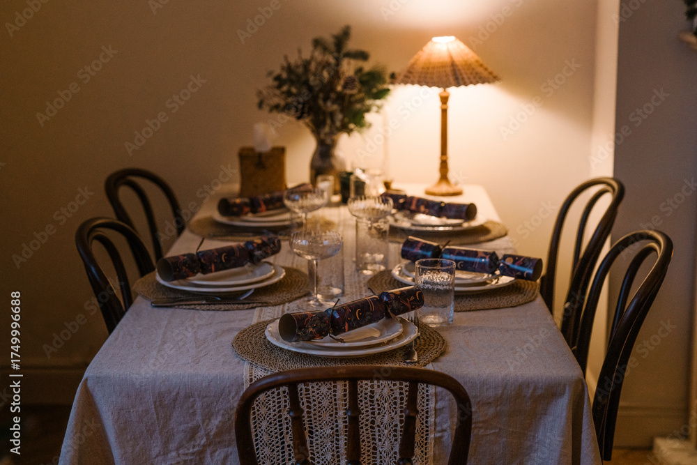 Warmly lit festive dinner table with rustic decor, Christmas crackers, candles, and a cozy winter atmosphere.