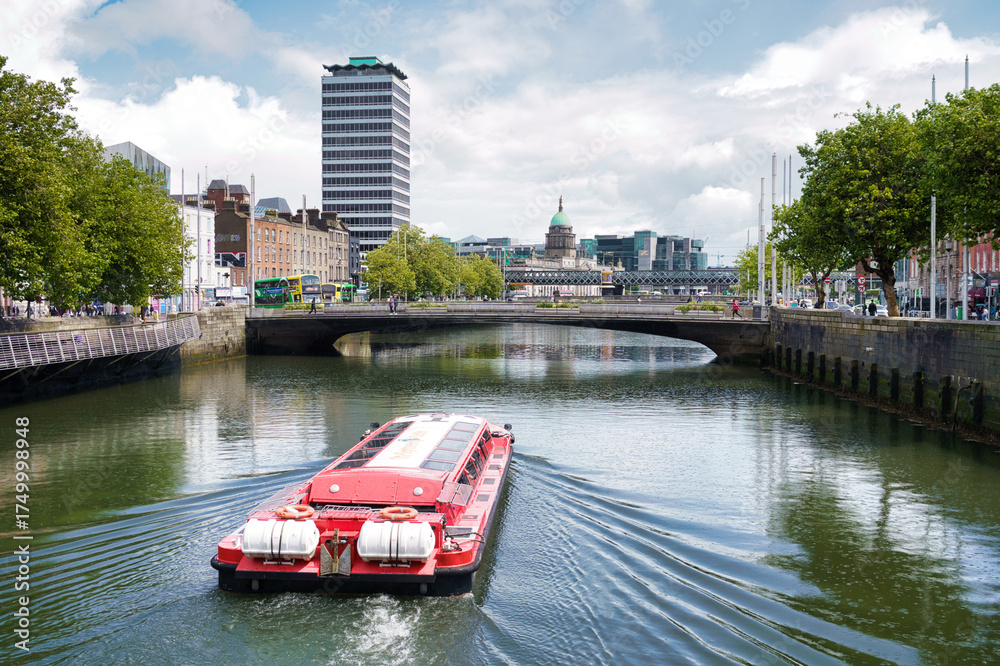 A vibrant shot of Dublin, Ireland, capturing the River Liffey with a tourist boat, bridges, and cityscapes under a bright sky.