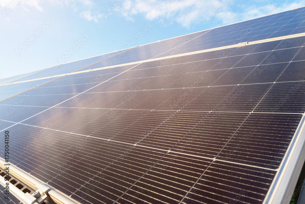 Close-up of photovoltaic solar panels producing renewable energy under bright daylight sky