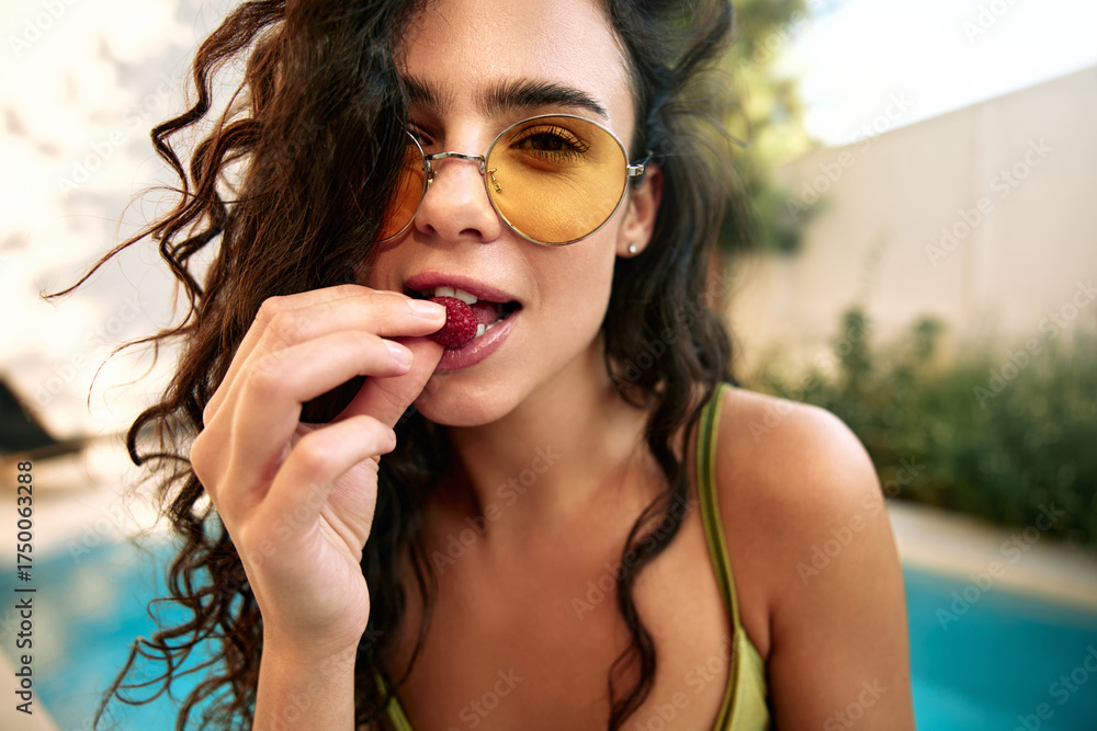 Young woman eating raspberry by the poolside in summer
