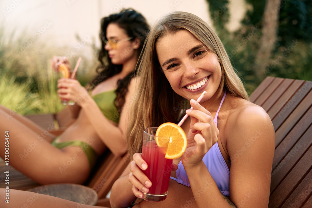 Smiling woman holding orange slice while relaxing with friend and drinking juice outdoors