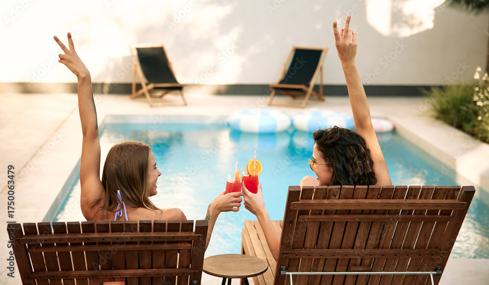 Women toasting drinks by the pool in summer vacation