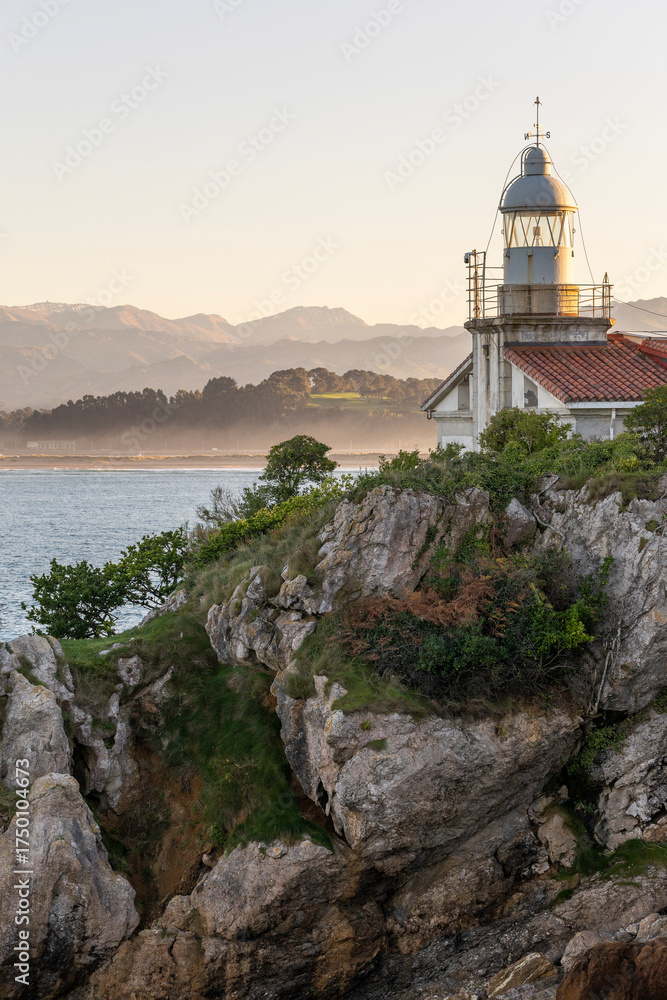 A scenic view of the Faro de la Cerda lighthouse on the rocky cliffs of the Magdalena Peninsula in Santander, Spain, during a golden hour sunset.