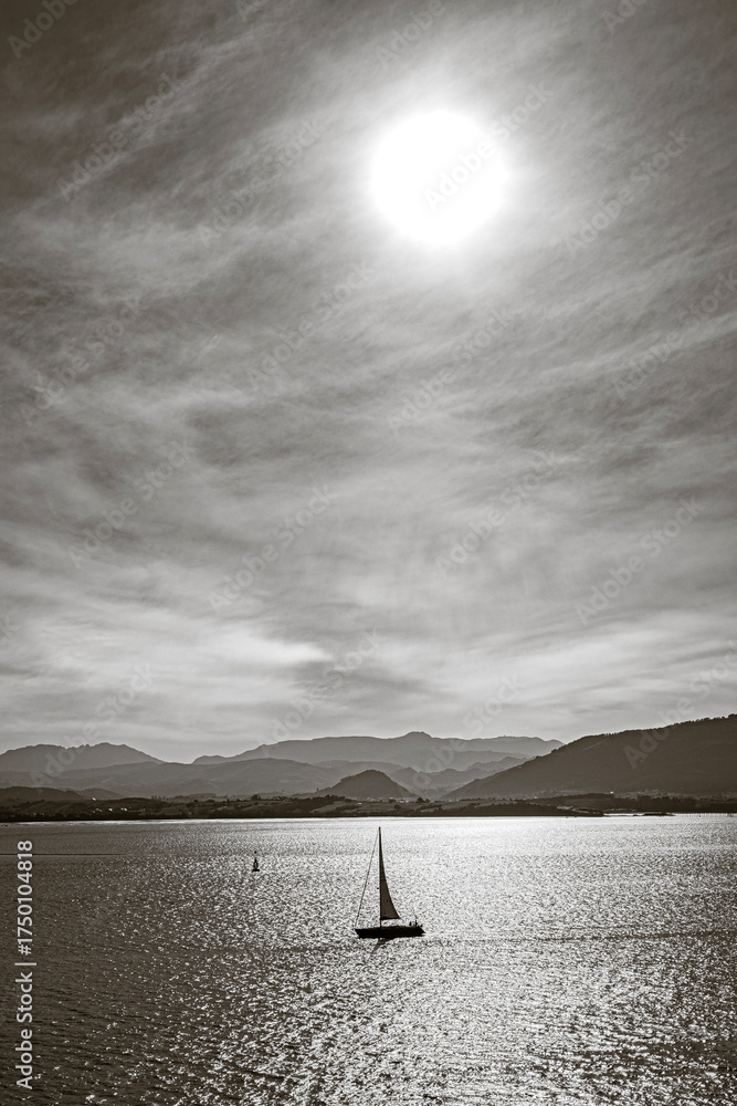 A black and white photograph of a lone sailboat on the glittering water of the Bay of Santander, with hazy mountains in the background.