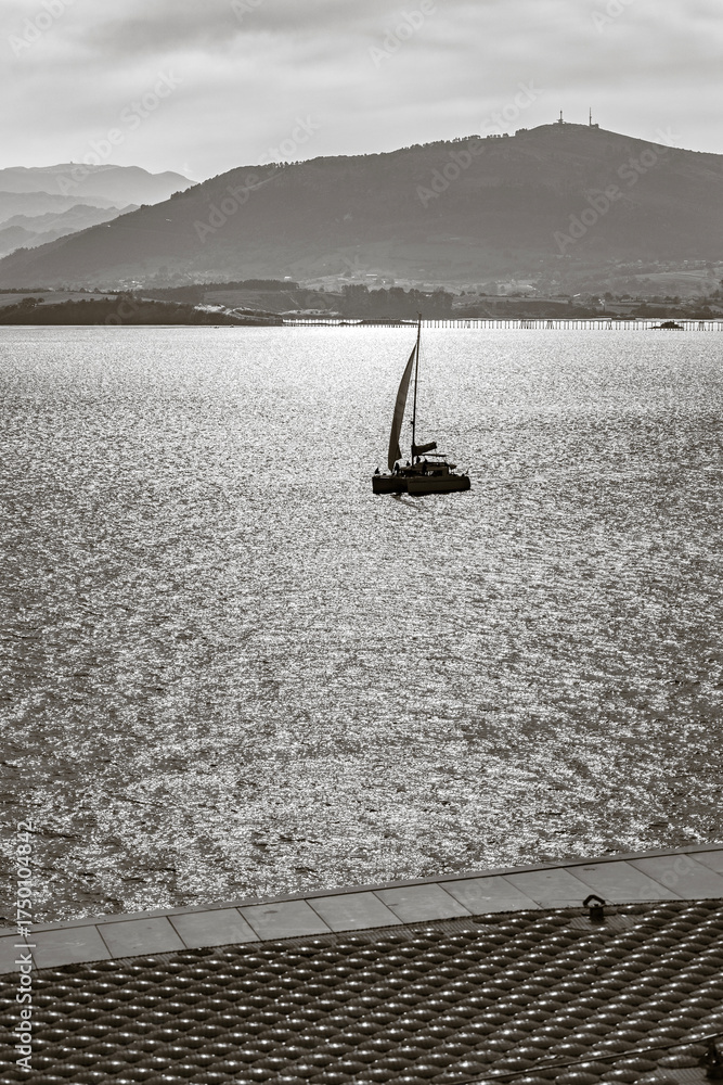 A black and white photograph of a lone sailboat on the glittering water of the Bay of Santander, with hazy mountains in the background.