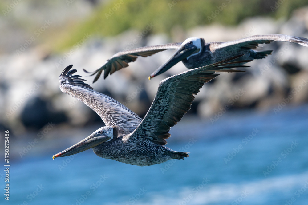 Brown pelican flying in beautiful light, seen in the wild in North California
