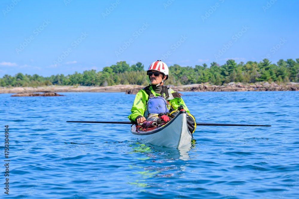 Active outdoor lifestyle: senior man in kayak on the water with safety equipment trees and rocks in background room for text shot on Geoirgian Bay