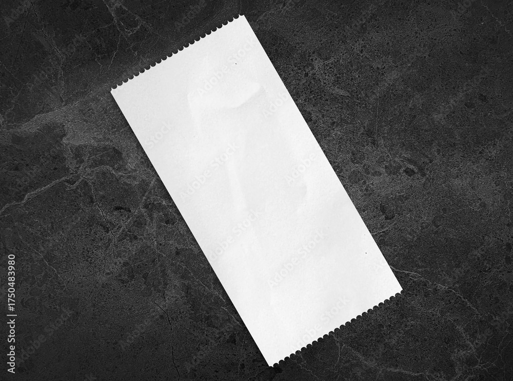 Cash receipt paper on black stone background. blank purchase bill invoice or supermarket shopping retail receipt. Plain white rectangular piece of paper with jagged on dark black background.