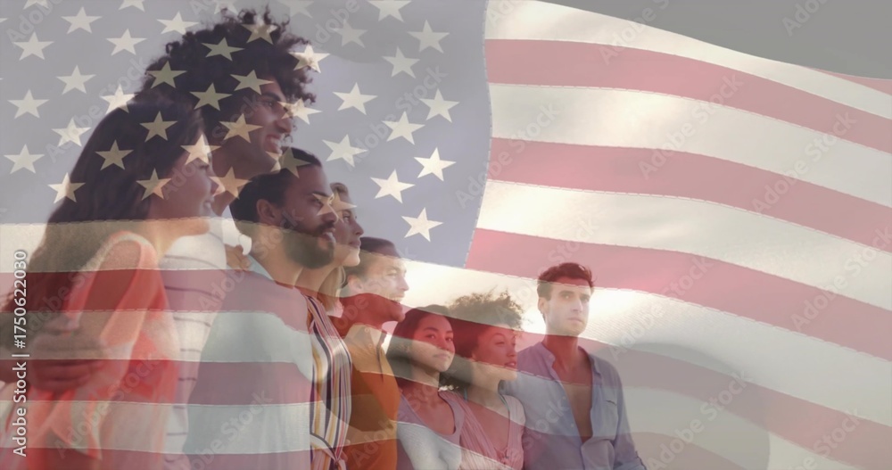 Standing eight adults wearing casual shirts facing horizon under clear sky, with US flag overlay