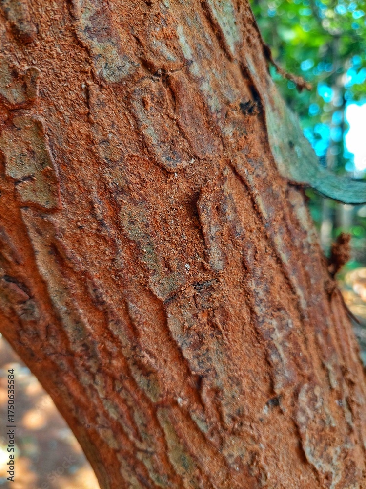 The mahogany bark appears dry with a rough texture and natural cracks, still firmly attached to the sturdy tree trunk.