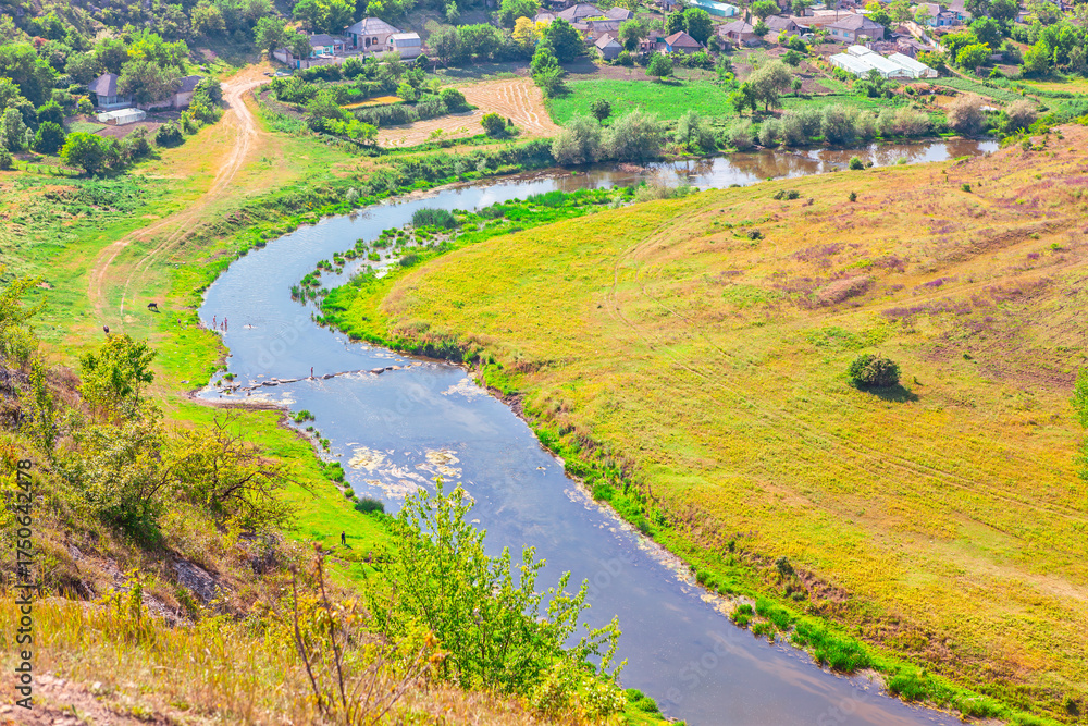 Raut River winds through the lush green landscape of Furceni village from Moldova. Surrounded by verdant hills and scattered houses, the meanders create a serene and picturesque view