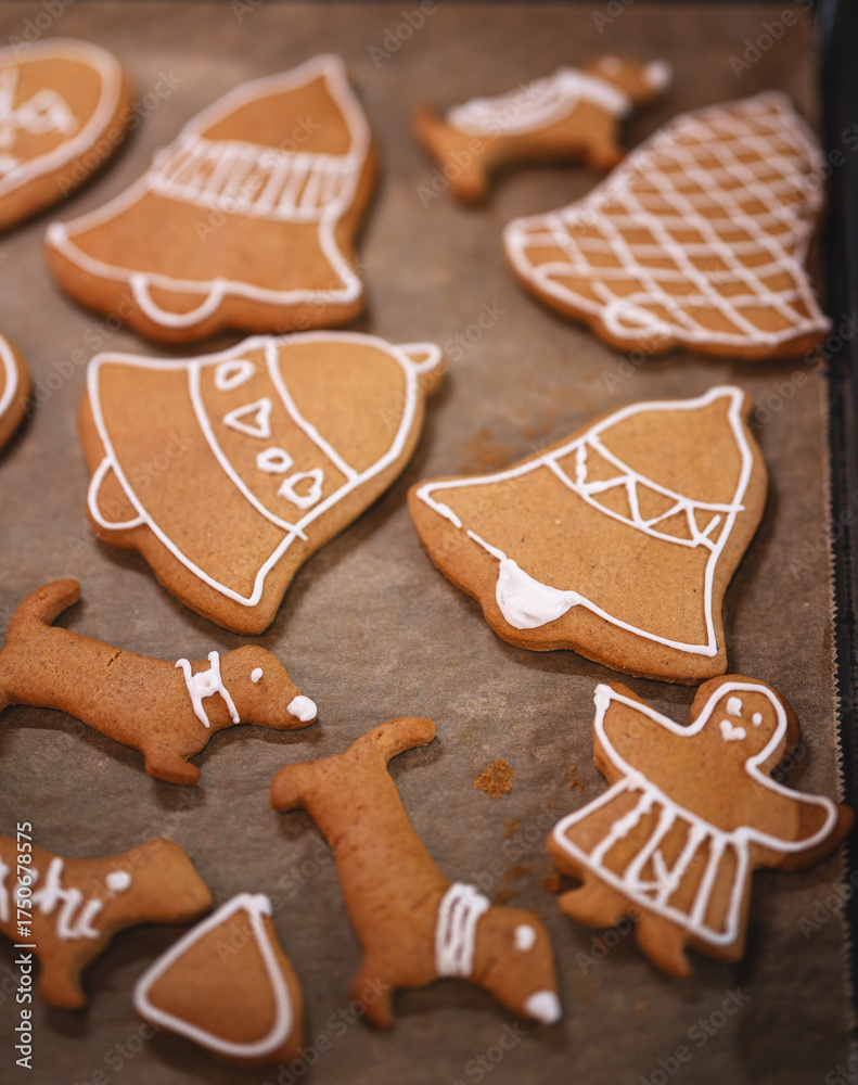 Gingerbread Christmas Cookies with Icing on Baking Tray