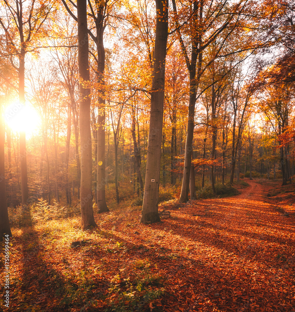 Autumn Forest Trail with Golden Leaves and Warm Light