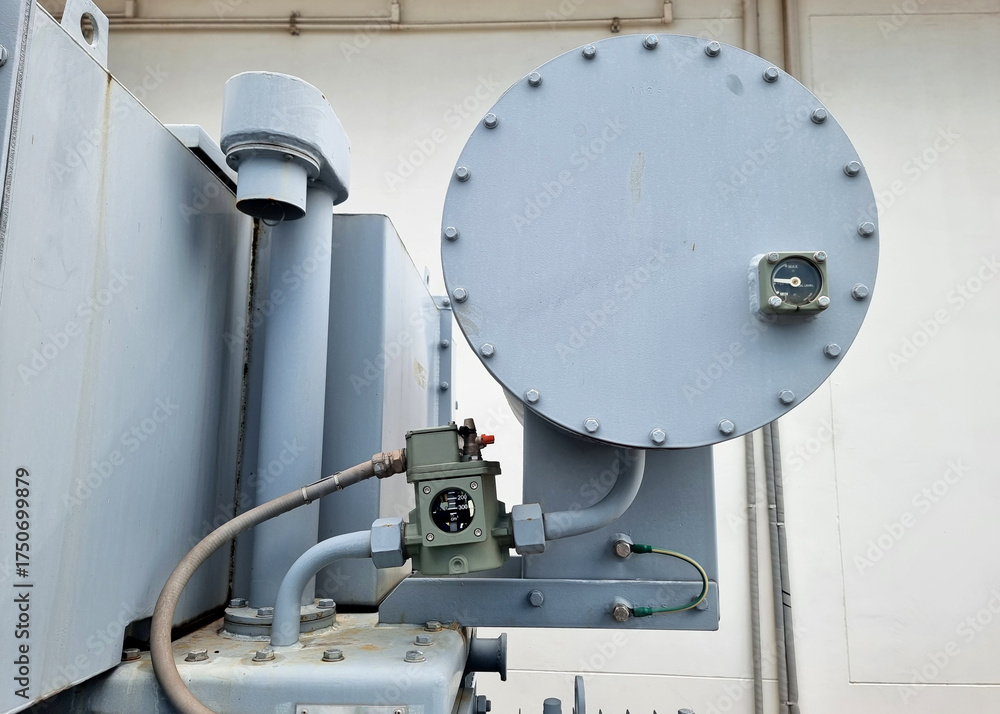 The distribution transformer conservator tank with oil level and Buchholz relay.