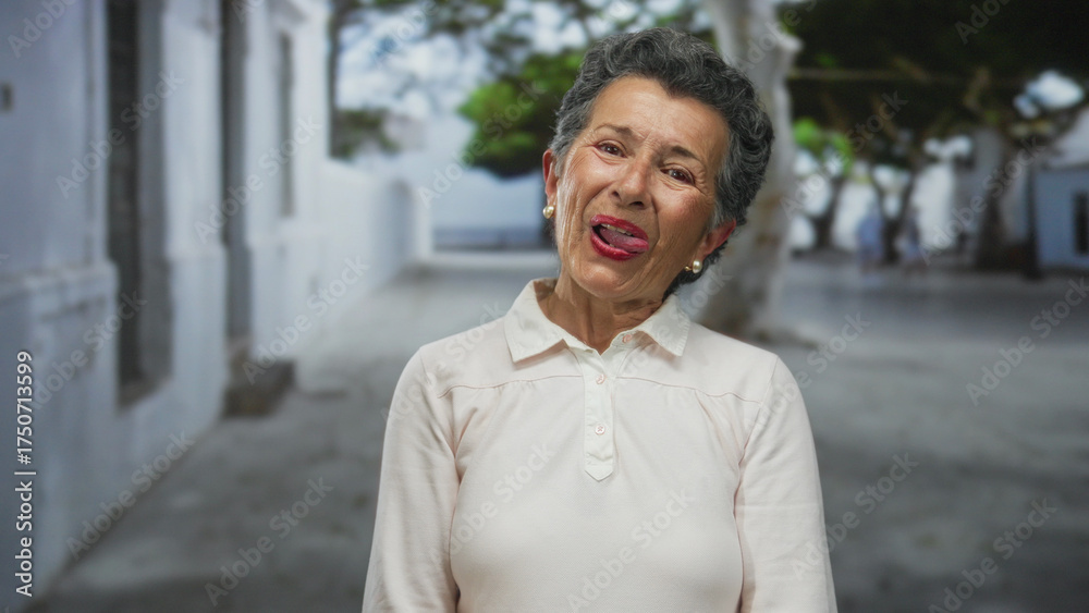 Senior woman with grey hair playfully posing on an urban street, blending warmth and charm in a lively city scene.