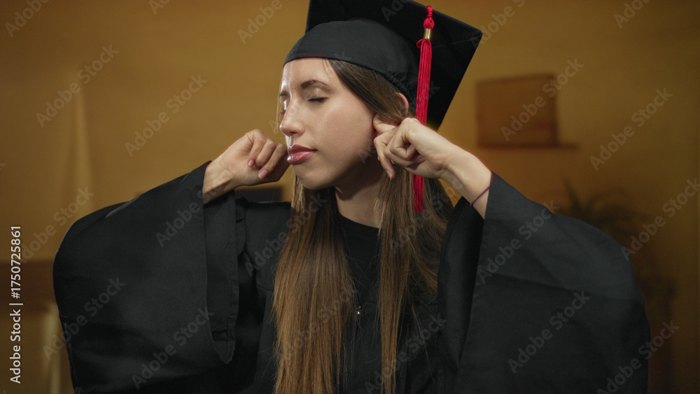 Woman wearing black graduation gown and mortarboard plugs ears with fingers in building; annoyance.