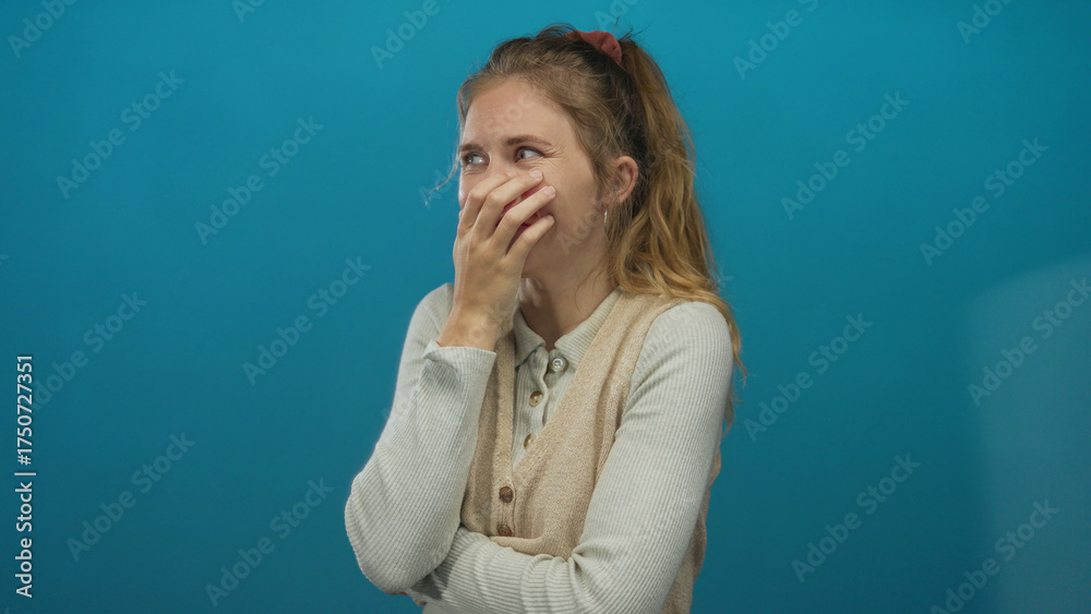 Woman using hand while laughing on a studio set shows a blonde style and young vibe covering a blue backdrop with a joyful smile gesture.