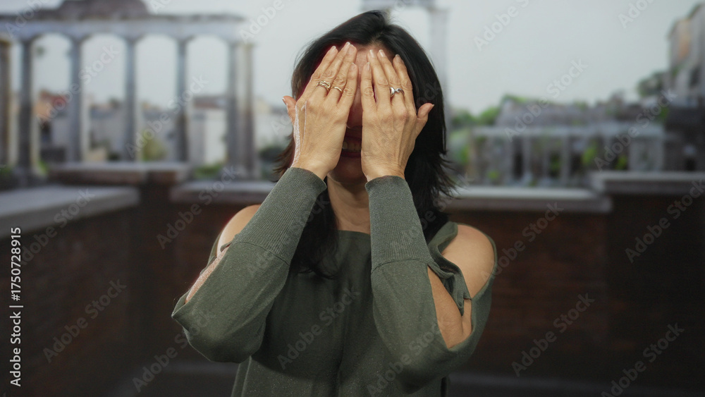 Woman smiling and covering face with hands in a green sweater at roman ruins building under soft daylight; playful joy.