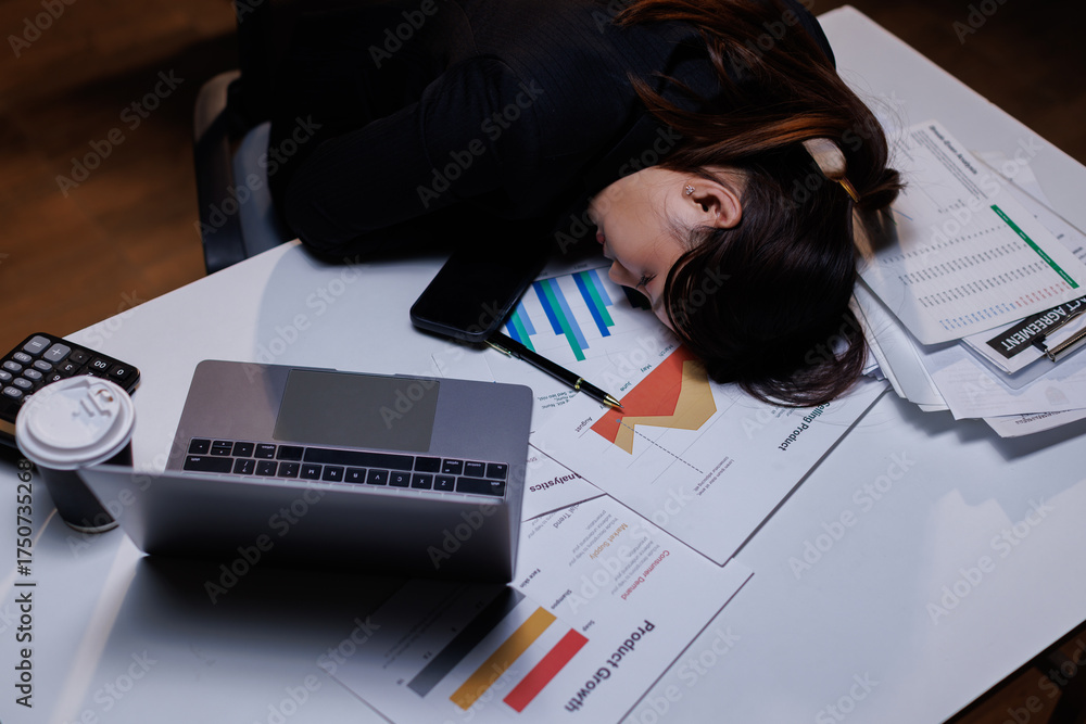 Business, tired asian woman with burnout, night and planning of budget, stress and sleepy in office. Exhausted, entrepreneur and working late on desk, overtime and person with fatigue and deadline