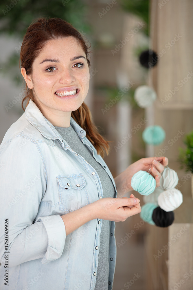 young woman decorator hanging up paper garlands