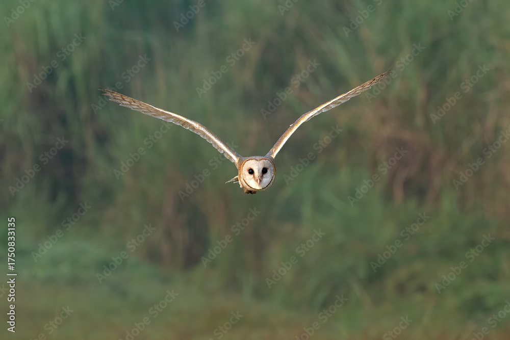 A barn owl (Tyto alba) gracefully flies over the rainforest in Java, Indonesia.