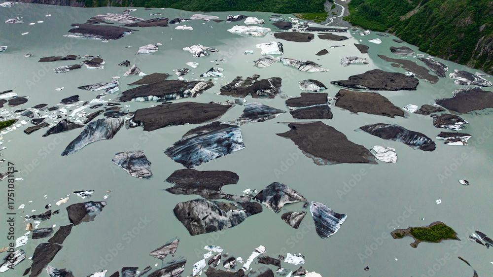 Floating icebergs in Alaska glacier lagoon aerial view. Floating icebergs in Alaskan glacier lagoon surrounded by mountains and cloudy sky.