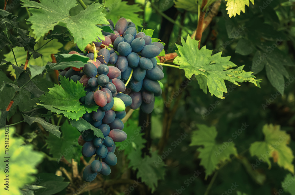 Cluster of dark blue, with green and purple particles, tasty and large, oblong, oval grapes, on vine