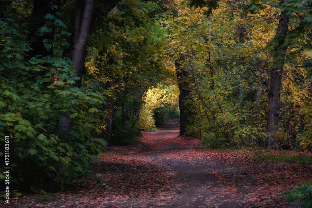 A path winds through a forest where the trees on either side form a natural tunnel or arch. The foliage on the trees is in autumnal hues, from rich green to yellow and gold.