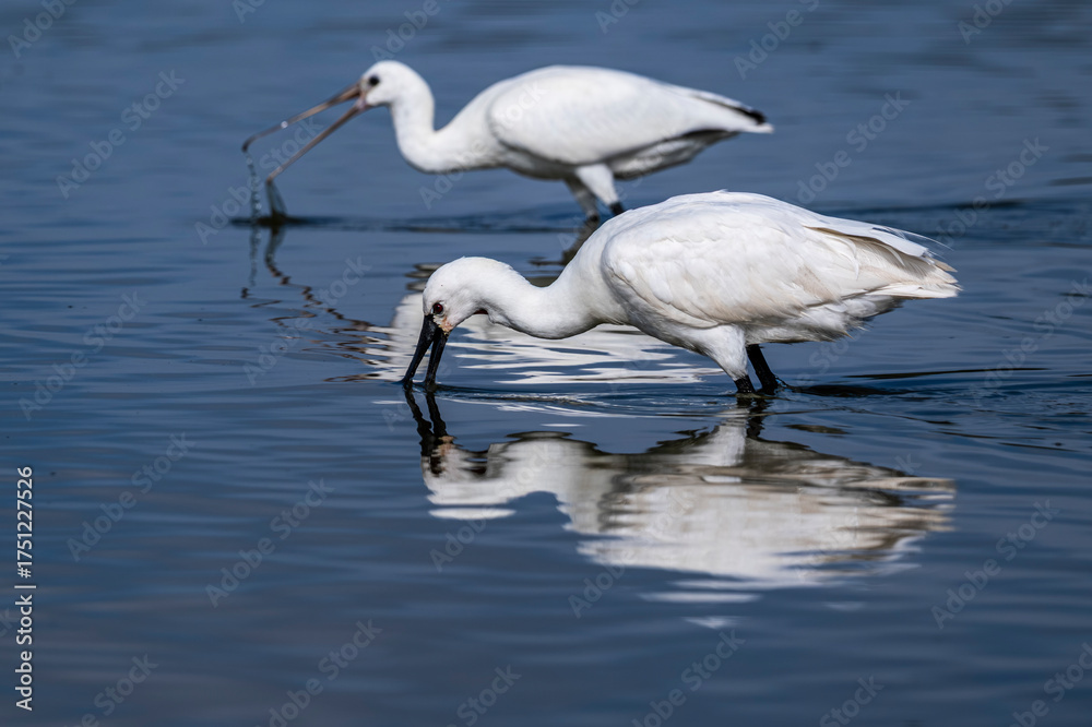 Les Spatules blanches (Platalea leucorodia - Eurasian Spoonbill) à la pêche