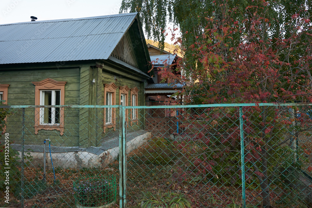A rural wooden house with window frames. Beyond the fence, in the front garden, a rowan tree with red berries grows. Autumn.