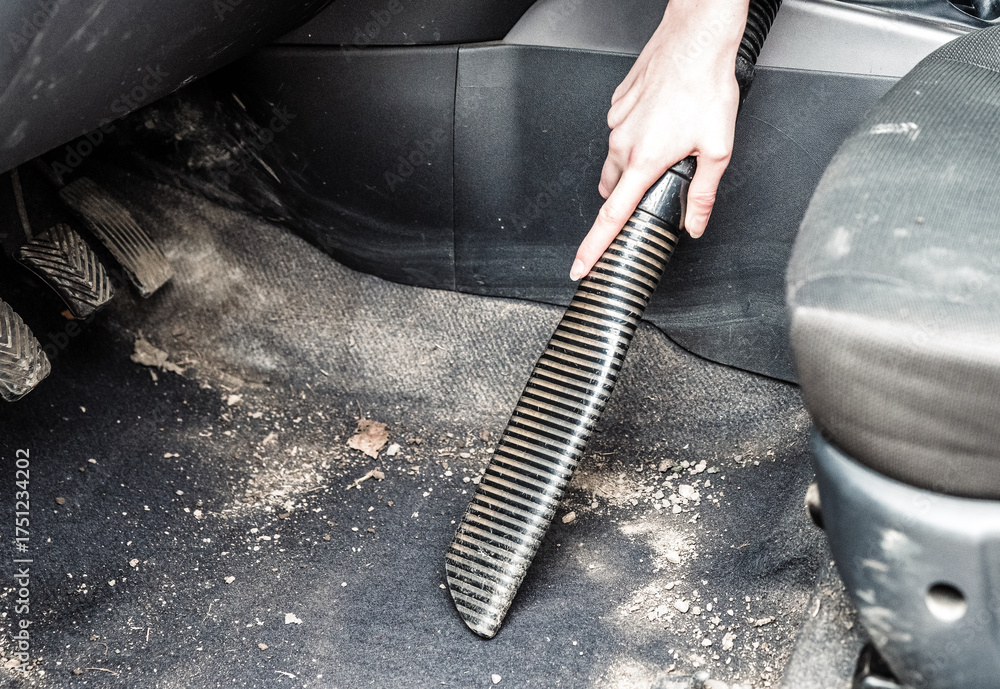 Woman cleaning dirty car interior carpet with vacuum cleaner