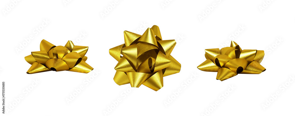 Set of golden paper ribbon bows isolated on white or transparent background. Top and profile views.