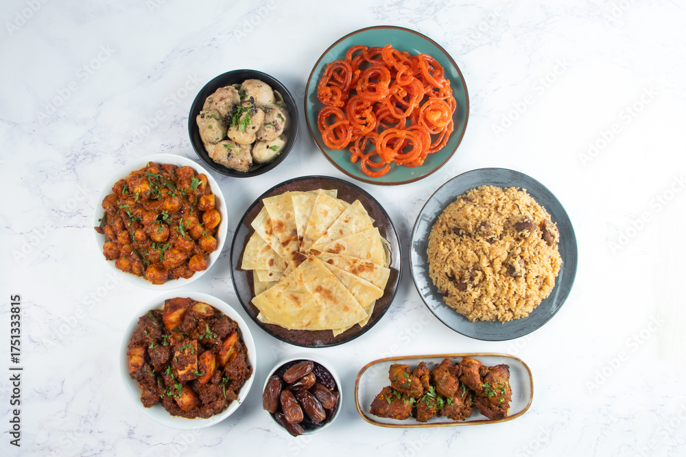 South Asian Iftar Feast Full Dinner Spread with Biryani, Curry, Paratha, Jalebi, Medjool Dates, Aloo Gosht, Dum Aloo, Chicken Malai Tikka Boti isolated on marble background top view