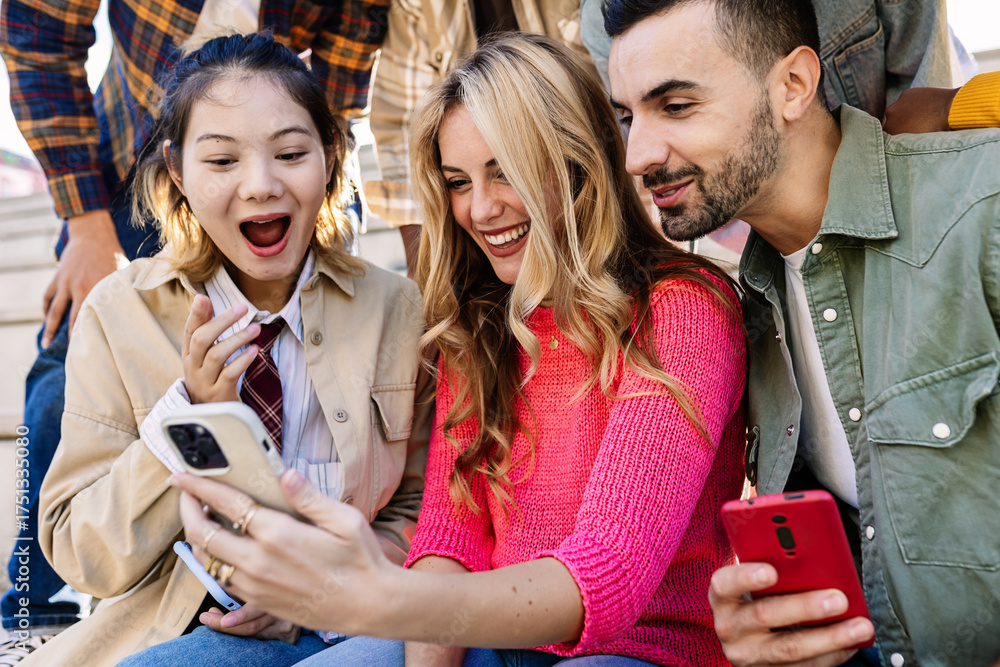 Group of diverse young friends outdoors using smartphones, laughing together while watching entertaining social media content. Friendship, youth community and technology lifestyle concept.