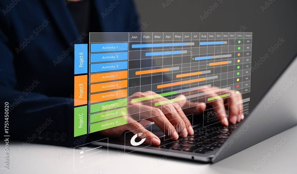 A person is using a laptop with a digital project management interface displayed, showcasing tasks and timelines in a professional setting.