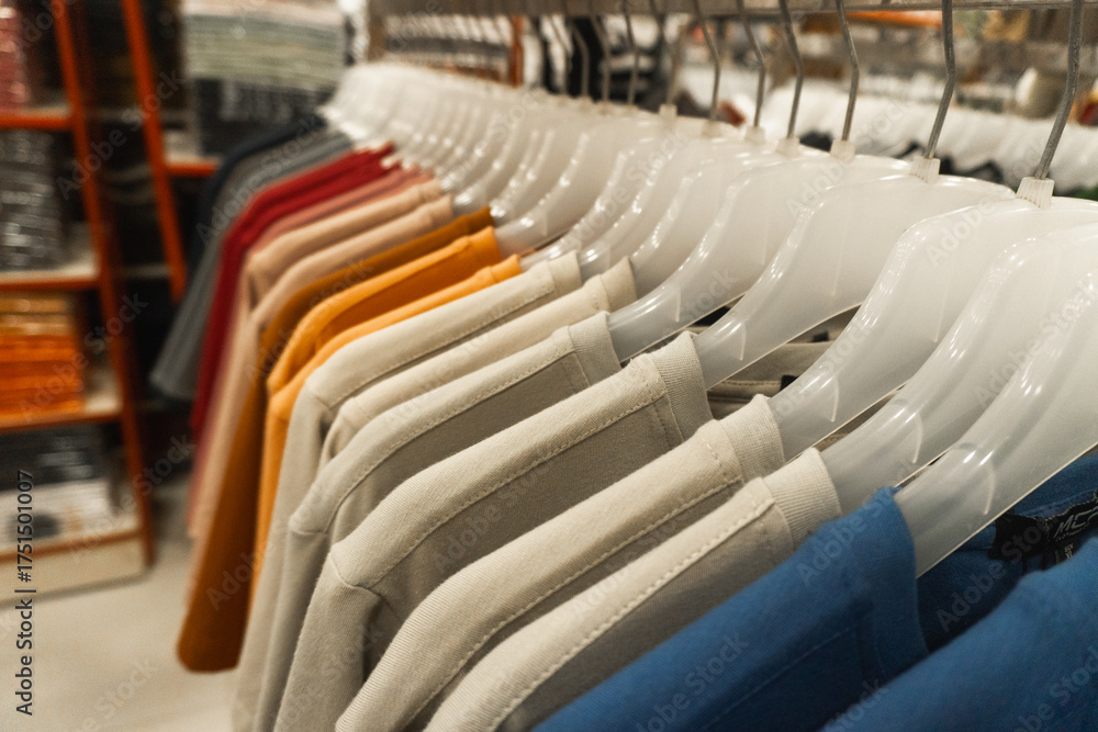 A row of colorful t-shirts neatly hanging on white plastic hangers in a clothing store, arranged by color from light to dark tones, creating a tidy and aesthetic display.